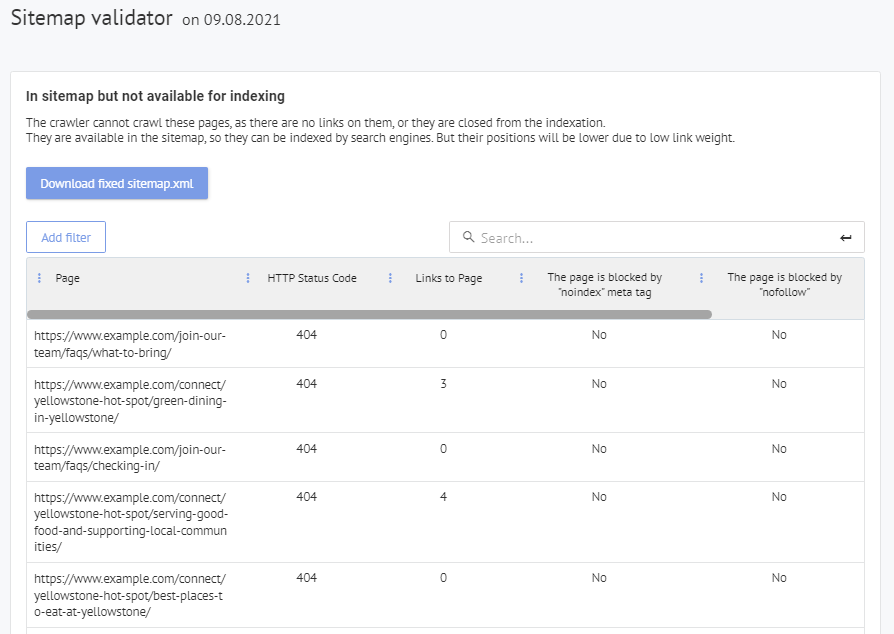 يمكنك أيضًا استخدام أداة التحقق من خريطة الموقع الخاصة بـ Labrika، هذا يمنحك الوصول إلى أي صفحات قد تكون على موقعك، لكنها غير قابلة للفهرسة. مما يجعلها طريقة سريعة وسهلة للوصول إلى قائمة بصفحات اليتيمة بسرعة!